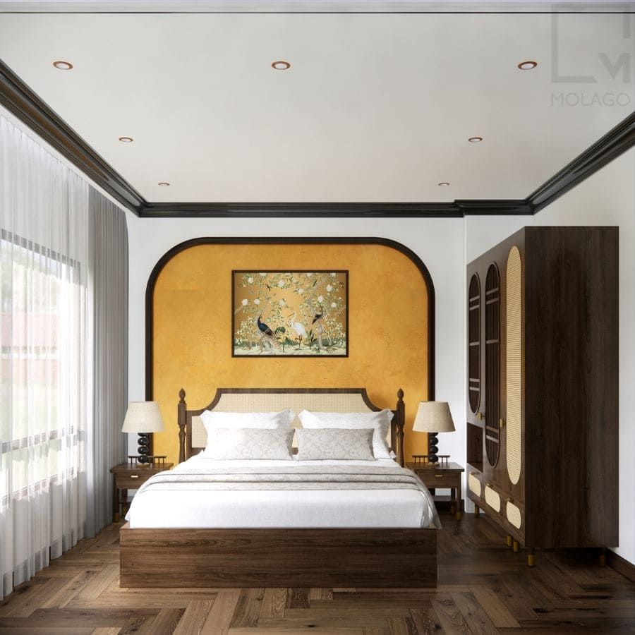 - Thiết kế sang trọng: Phong cách Indochine với màu nâu gỗ đậm mang lại vẻ đẹp thanh lịch và ấm cúng cho không gian phòng ngủ.