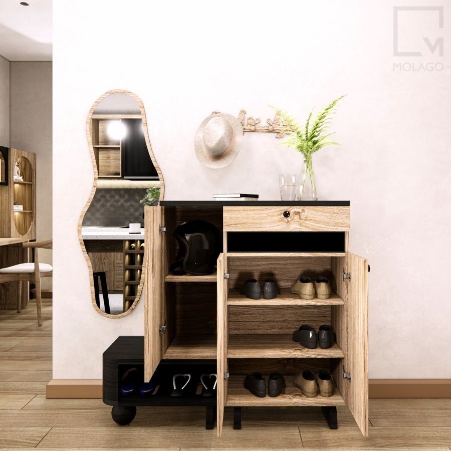 - Sắp xếp gọn gàng: Tủ giày giúp lưu trữ giày dép và các vật dụng cá nhân khác, trong khi móc treo hỗ trợ sắp xếp áo khoác, túi xách. Gương soi toàn thân giúp bạn hoàn thiện phong cách trước khi ra ngoài.