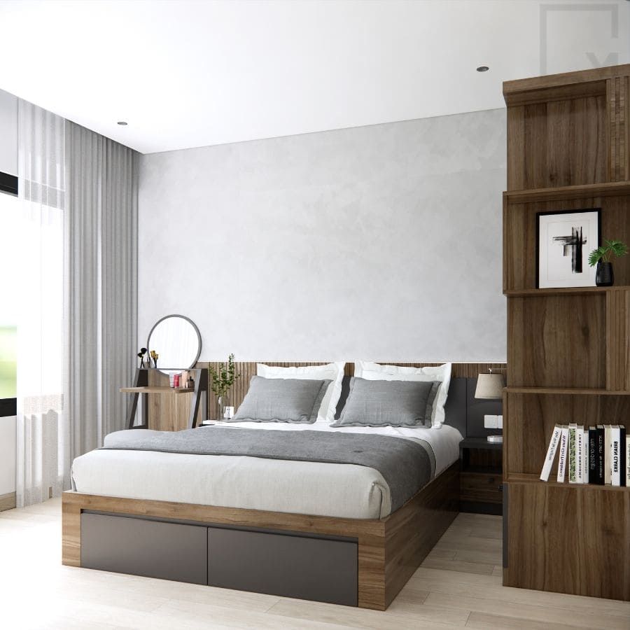 - Vách Đầu Giường Với Họa Tiết Sọc Trang Trí: Vách đầu giường được thiết kế với họa tiết sọc trang trí tinh tế, tạo điểm nhấn nổi bật và thêm phần sang trọng cho không gian phòng ngủ.