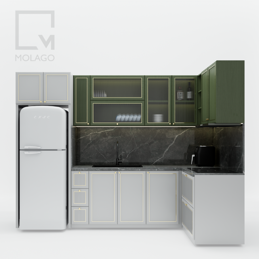 - Chất liệu cao cấp: Tủ bếp được làm từ MDF melamine kháng ẩm, kết hợp với panel kính cường lực và gỗ tự nhiên, mang lại vẻ đẹp sang trọng, hiện đại và độ bền cao.