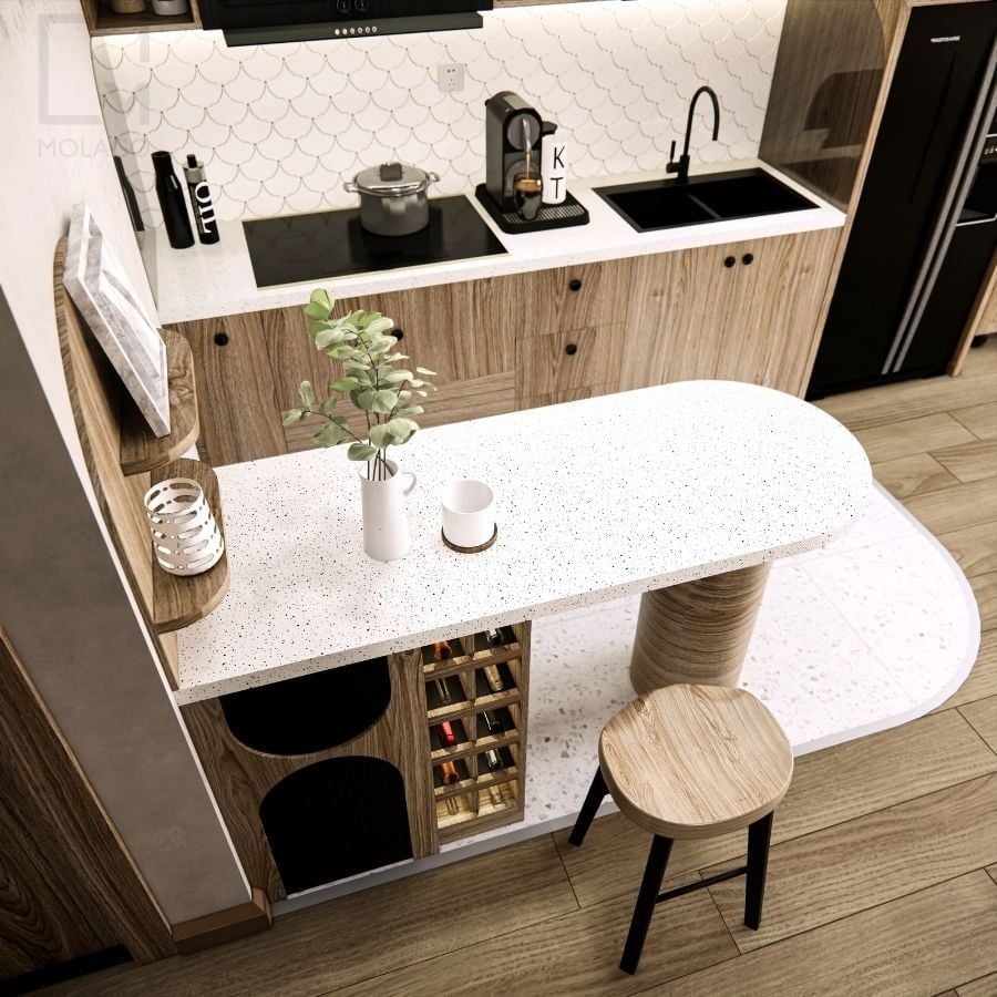 - Mặt đảo ốp đá nhân tạo: kim sa trung/trắng, terrazo hạt vàng (tương ứng với mặt bếp).