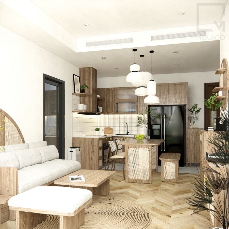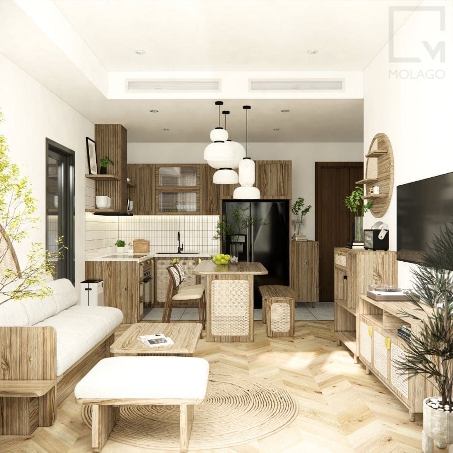 - Thiết kế hiện đại, tinh tế: Sự kết hợp hoàn hảo giữa MDF melamine, mây đan và gỗ tự nhiên tạo nên không gian sống sang trọng, gần gũi và đầy cảm hứng.