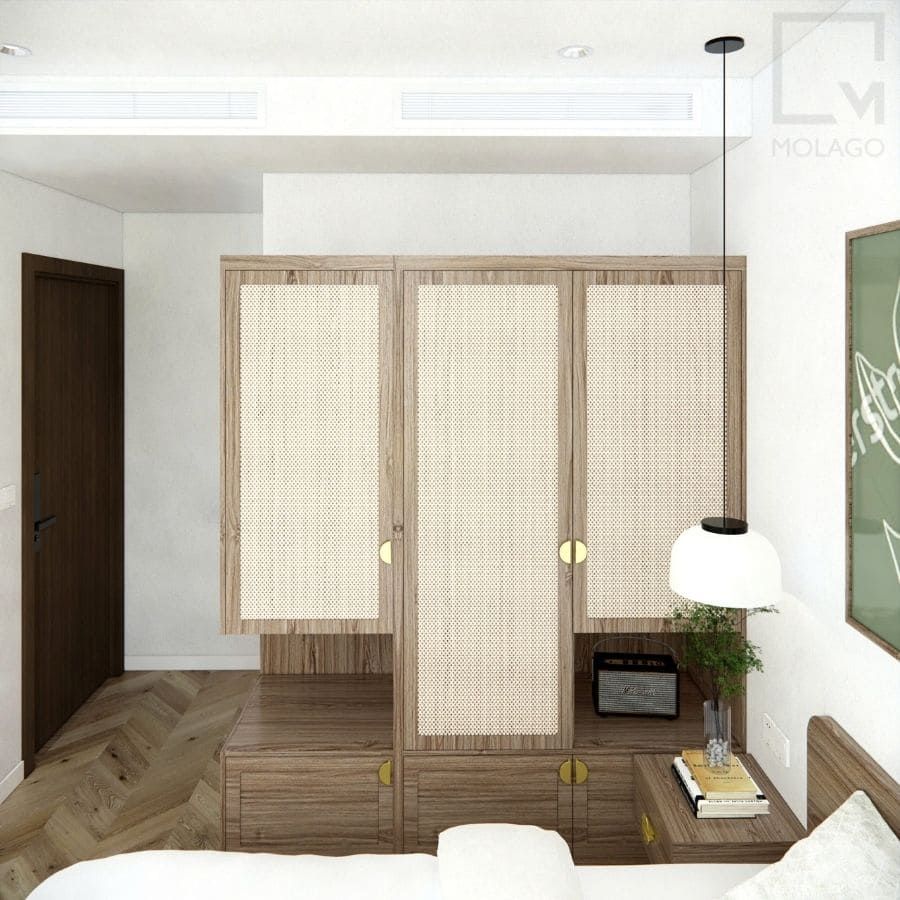 - Tủ quần áo nhỏ gọn với thiết kế tối giản, nhưng vẫn đảm bảo lưu trữ đầy đủ các vật dụng cá nhân.