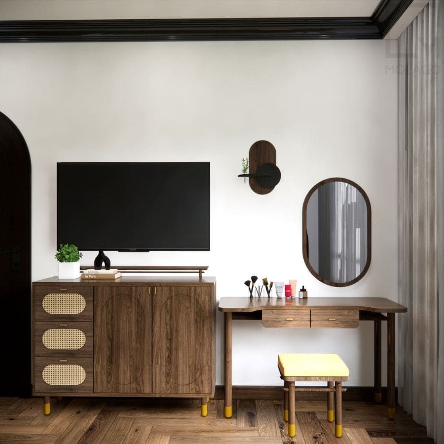 - Phong Cách Indochine: Màu nâu gỗ đậm và phối mây đan mang lại sự ấm cúng và tinh tế, phù hợp với nhiều phong cách nội thất.
